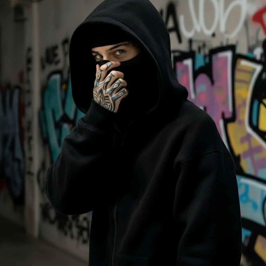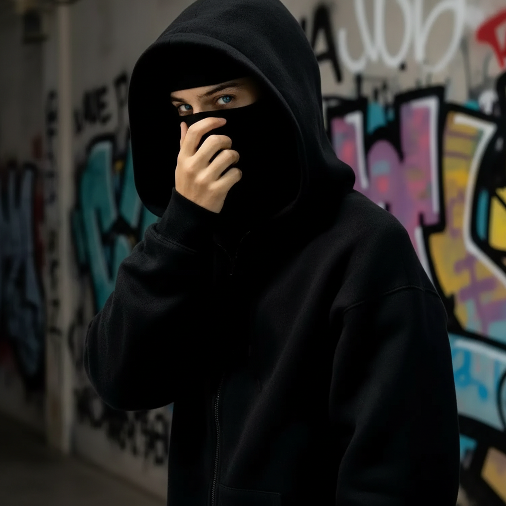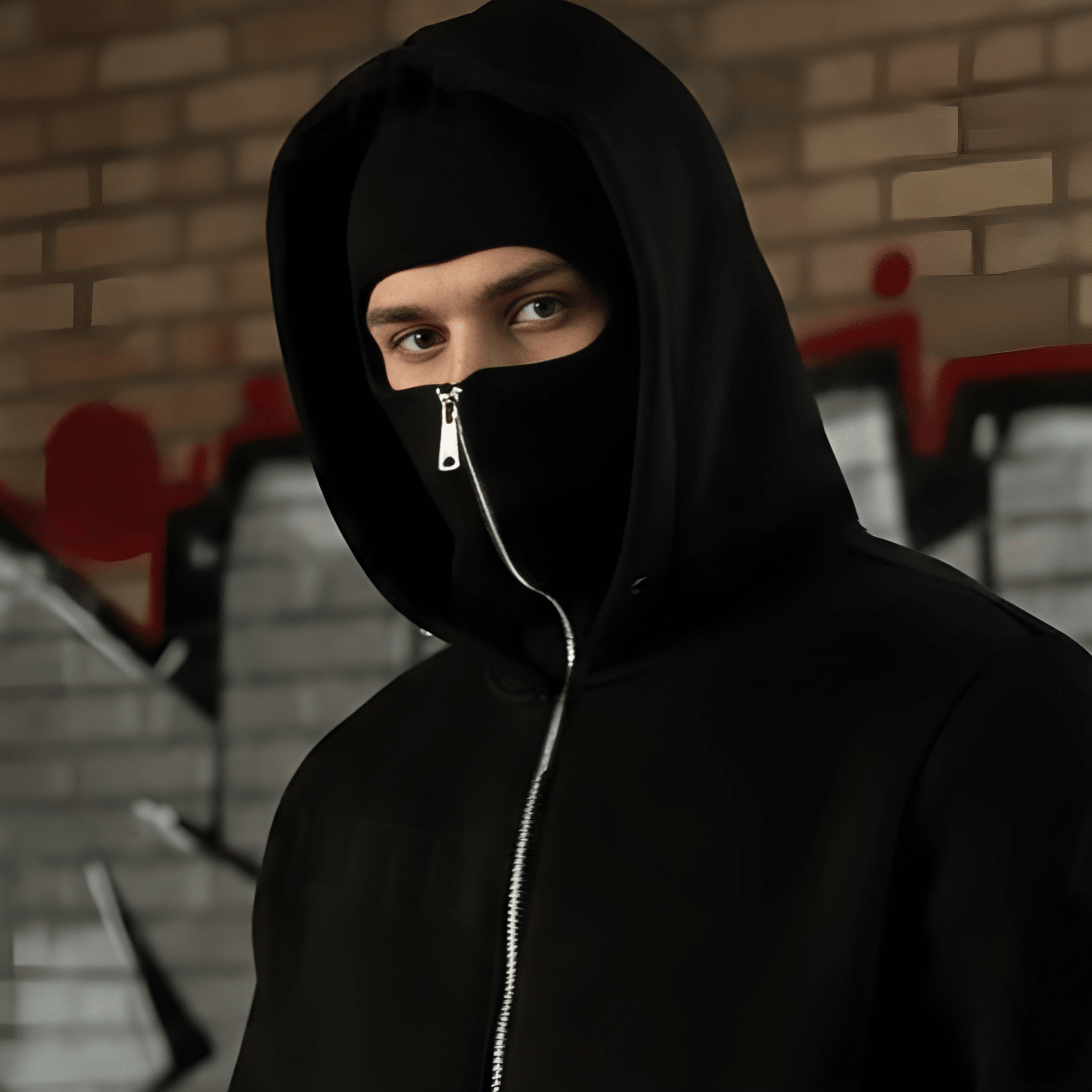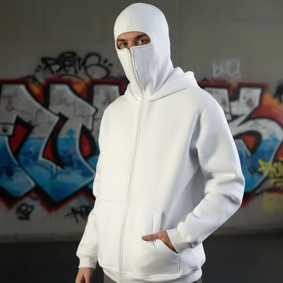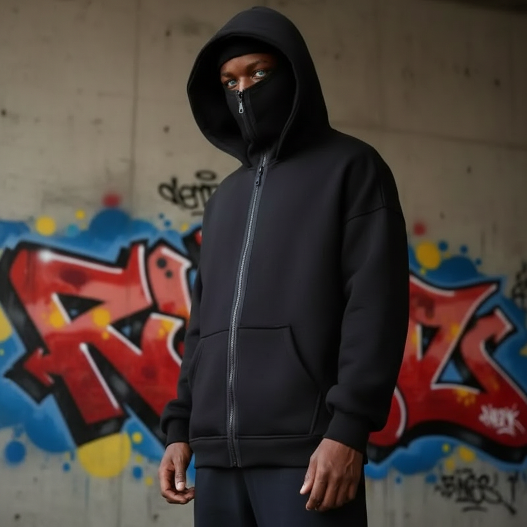 מסכת פנים מובנית מבד רך ונושם, משתלבת בקפוצון ונשלפת בקלות בלי אביזרים מיותרים